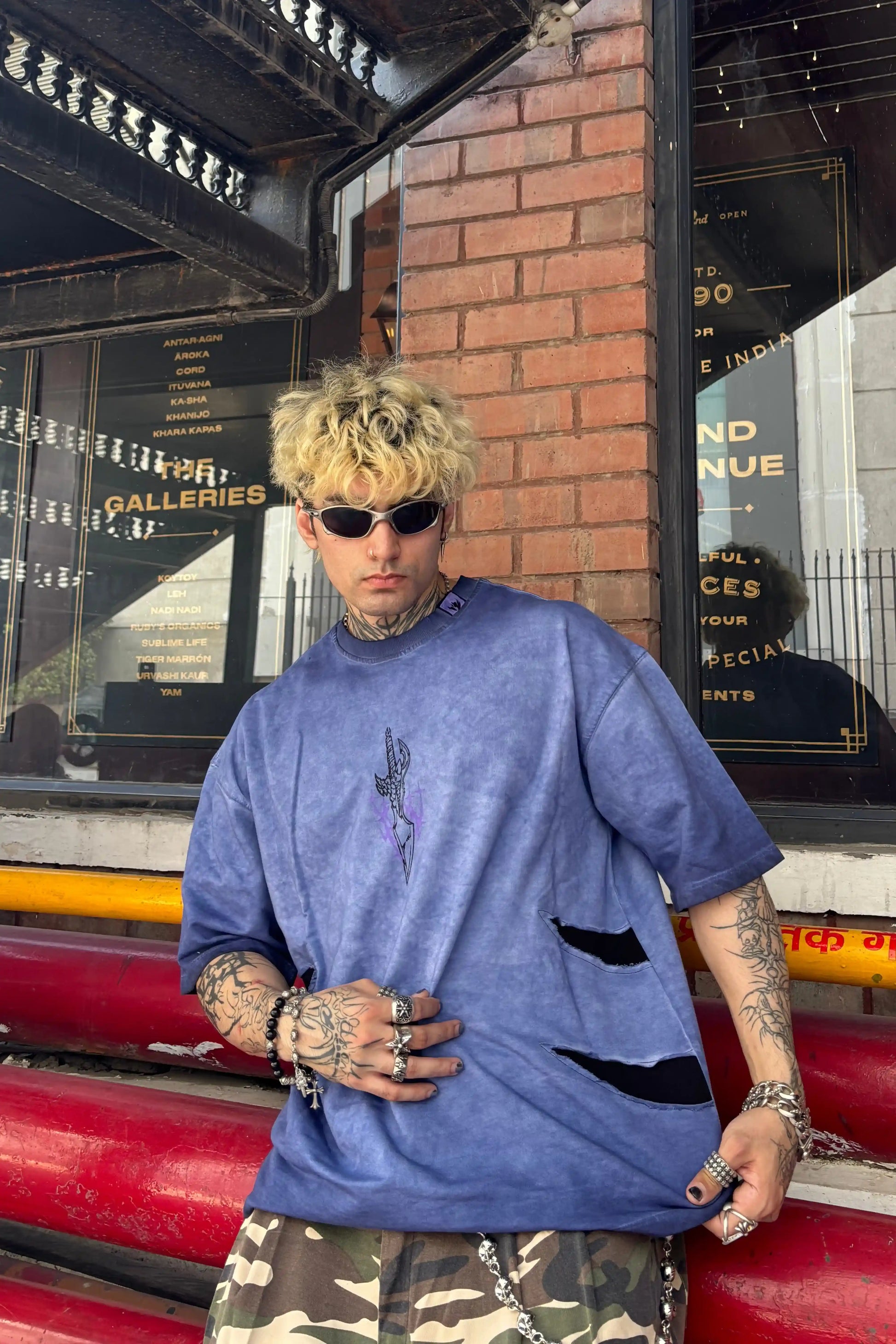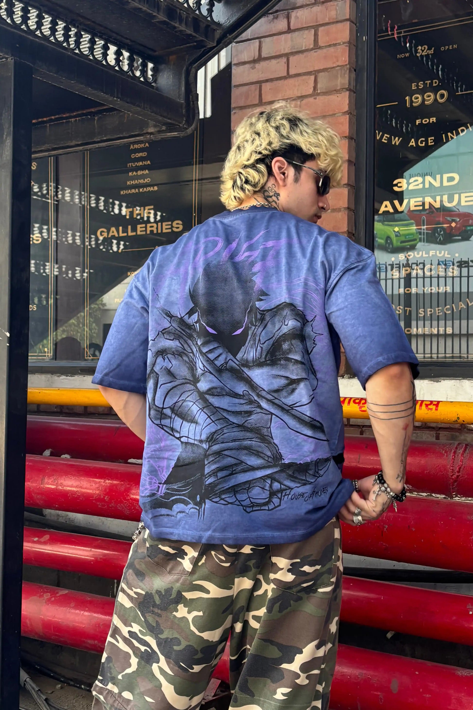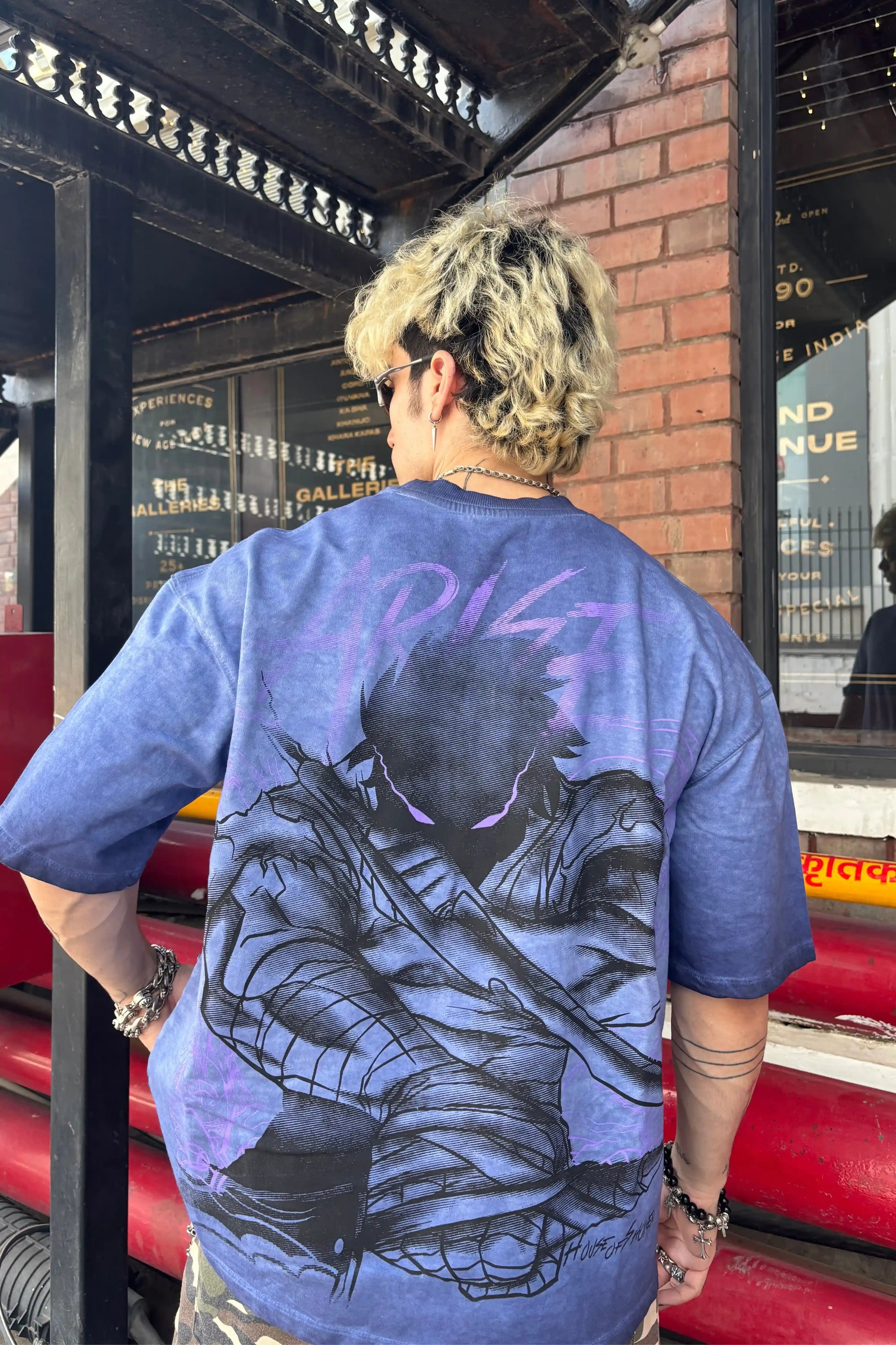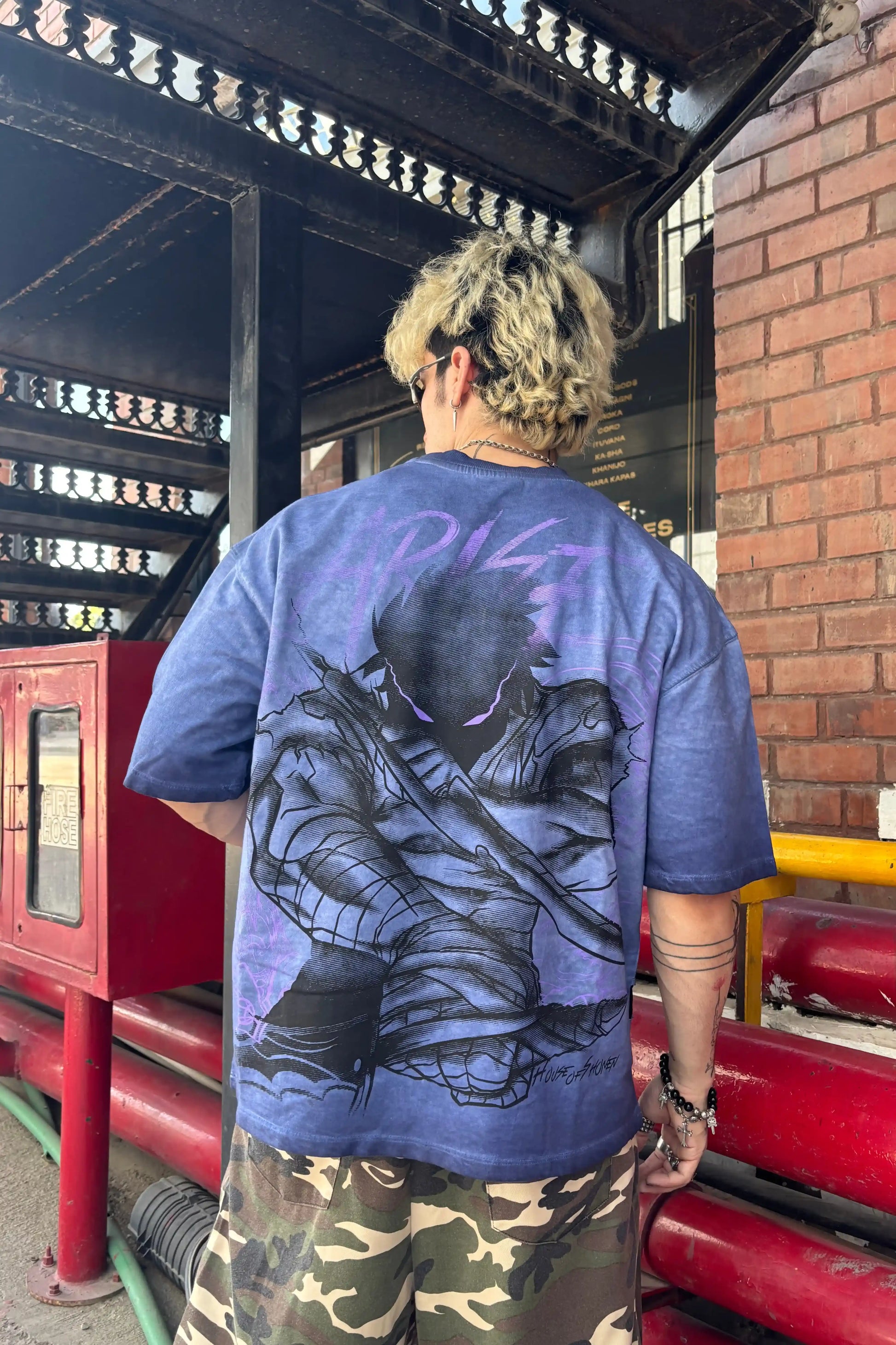 The front features subtle, distressed-style cut-out black claw marks, & his iconic weapon, symbolizing his relentless fierce ascent. The back features a striking portrayal of his summons, & full-back shadow print that embodies his commanding presence. his tee is more than apparel; it's a statement of allegiance to Jin-Woo's journey.