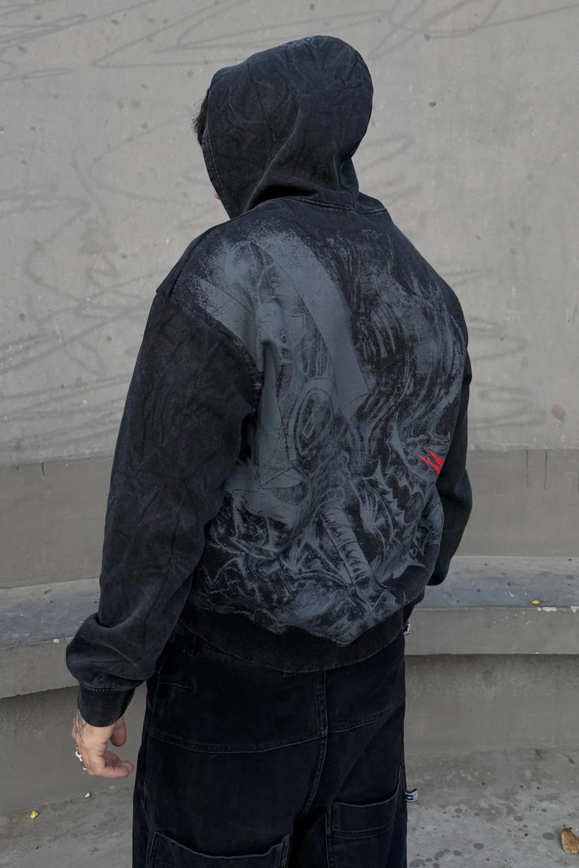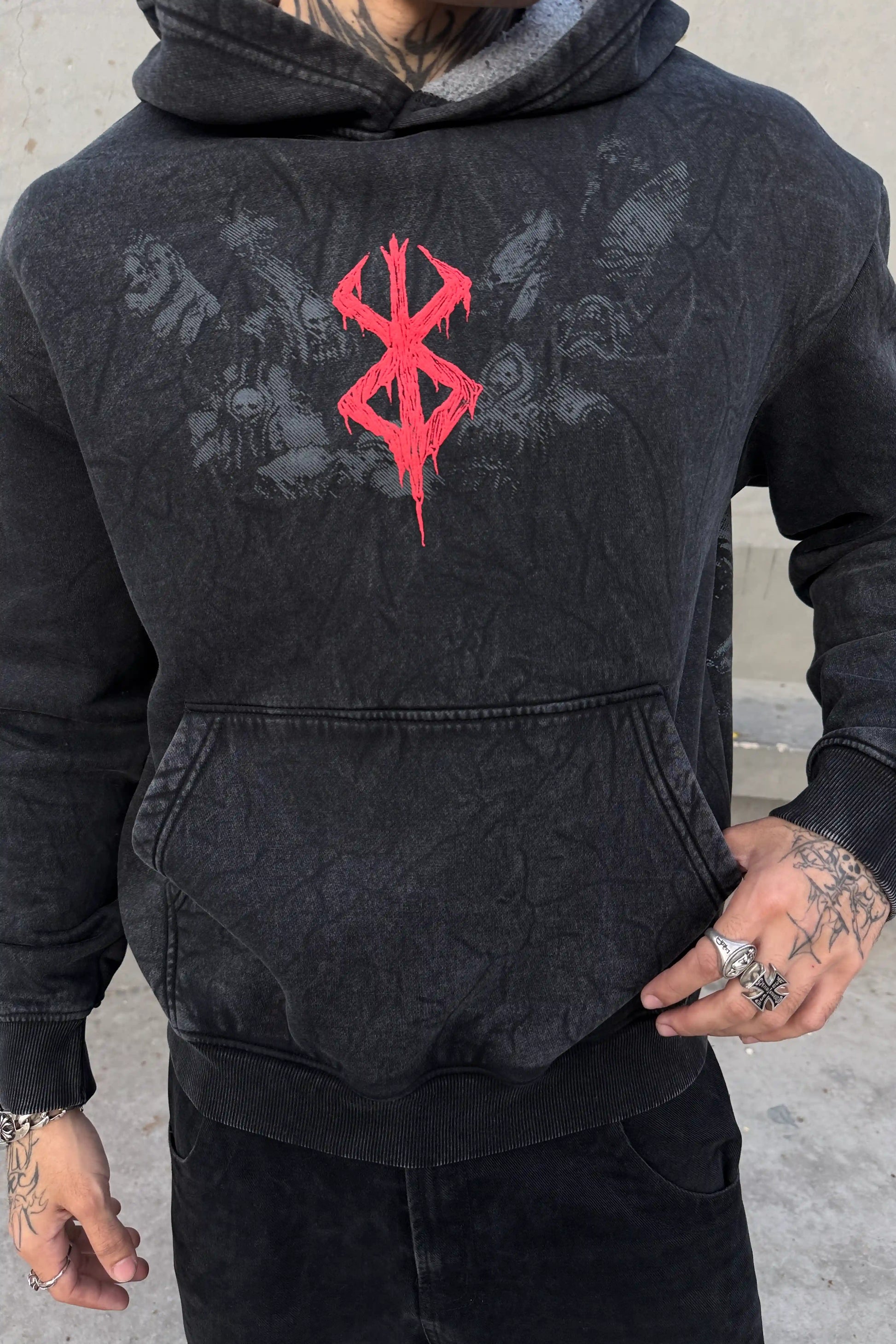 Brutal, unrelenting darkness defines this piece — fate carved deep, pain worn like armor. The front bears a puff-printed Brand of Sacrifice, a mark that invites death and refuses surrender. Turn to the back and the war unfolds: Guts in full armor, rage forged in steel, with Griffith hidden within the blade — a betrayal only true fans will see. Finished in a black acid wash, every detail feels cursed by destiny. This piece is only for die-hard Berserk fans.